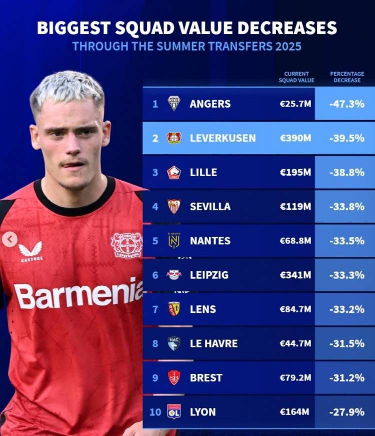 德转列今夏身价下跌比例榜:法甲7队,药厂、塞维、莱比锡在列